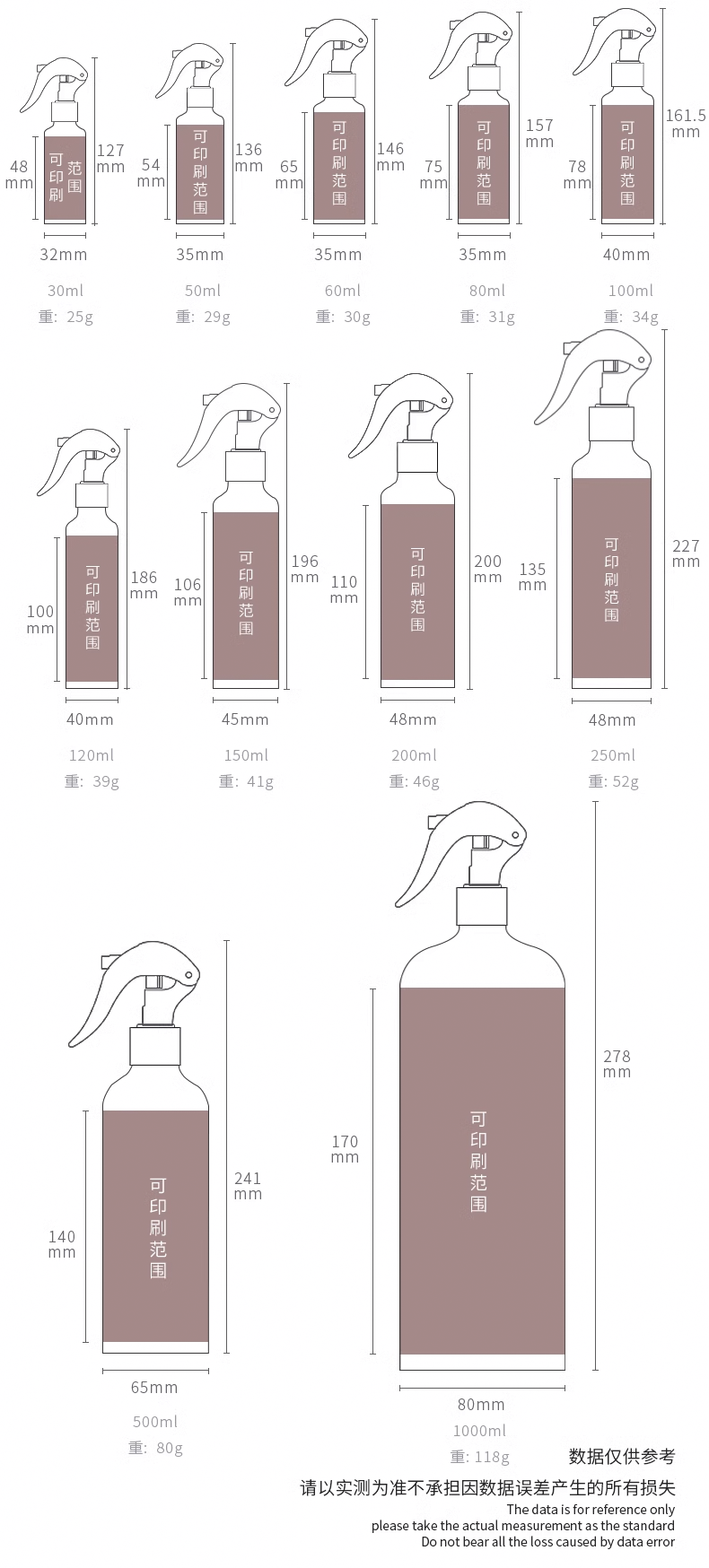 Material:aluminum bottle, PP hand mist sprayer. Capacity:20ml to 1000ml (30ml 50ml 100ml 120ml 150ml 200ml 250ml 300ml are in stock)