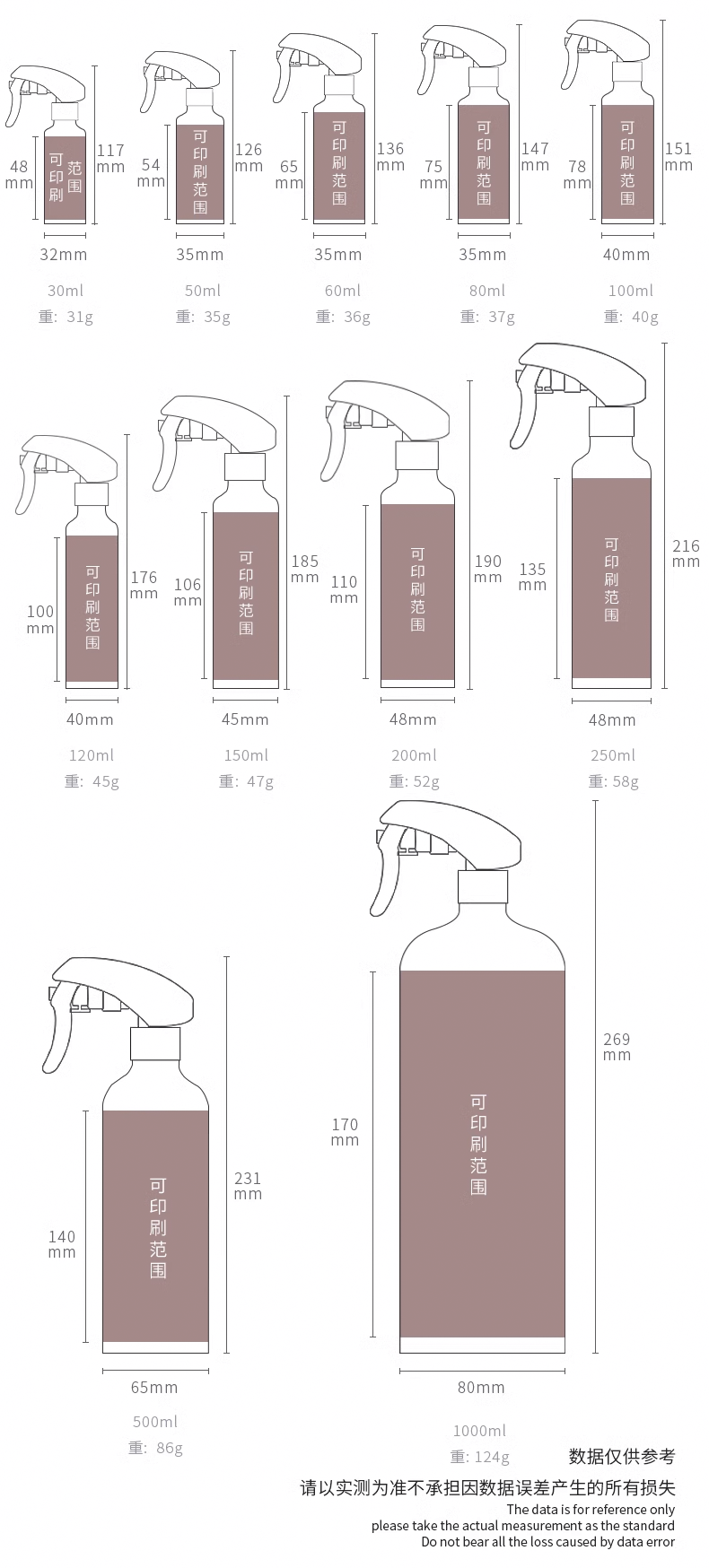 Material:aluminum bottle, PP hand mist sprayer. Capacity:20ml to 1000ml (30ml 50ml 100ml 120ml 150ml 200ml 250ml 300ml are in stock)
