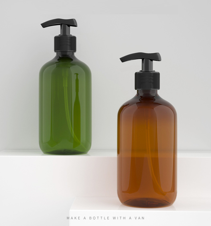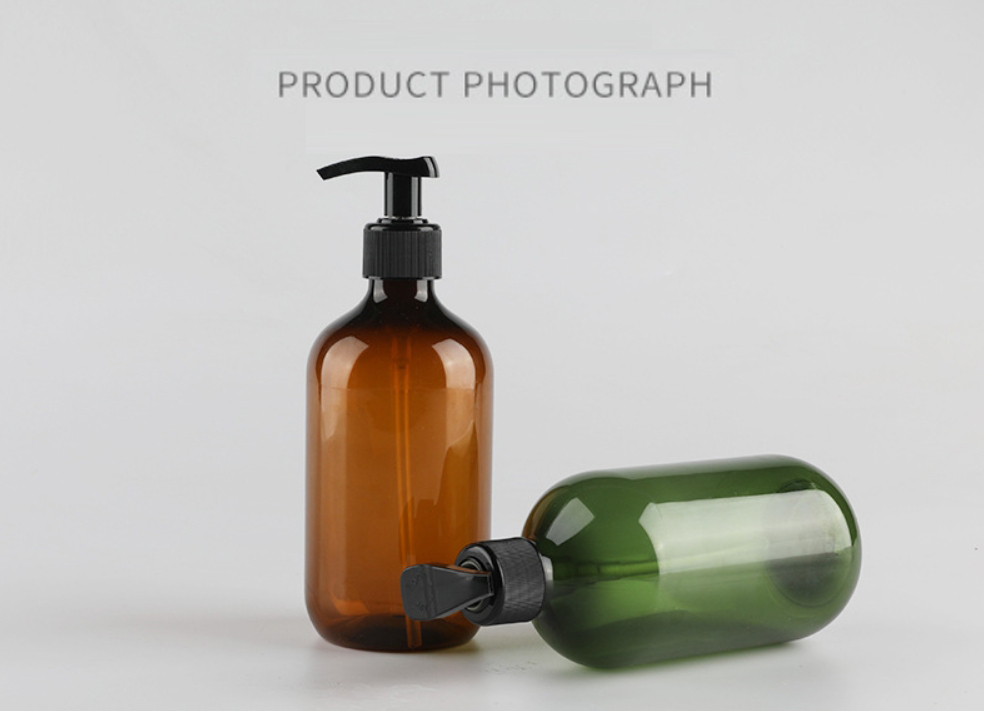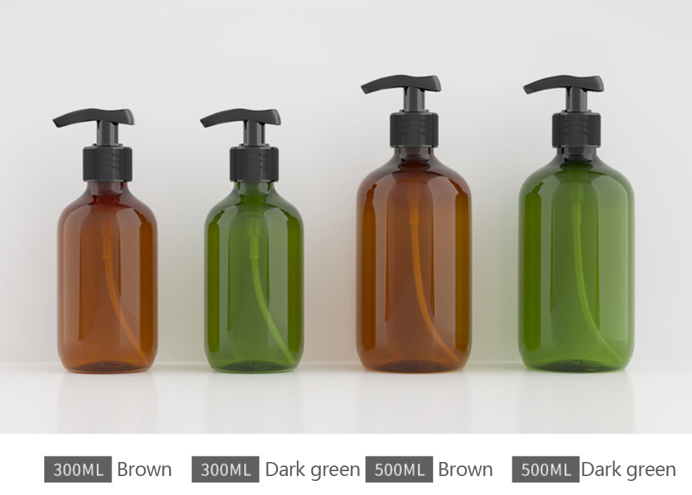 Capacity: 300/500ML Weight: 48/55G Color: brown, dark green Material: PET, PP Production process: silk screen printing, labeling, color, sandblasting, thermal transfer Application: Suitable for shampoo, shower gel, facial cleanser, body lotion and other liquid products.