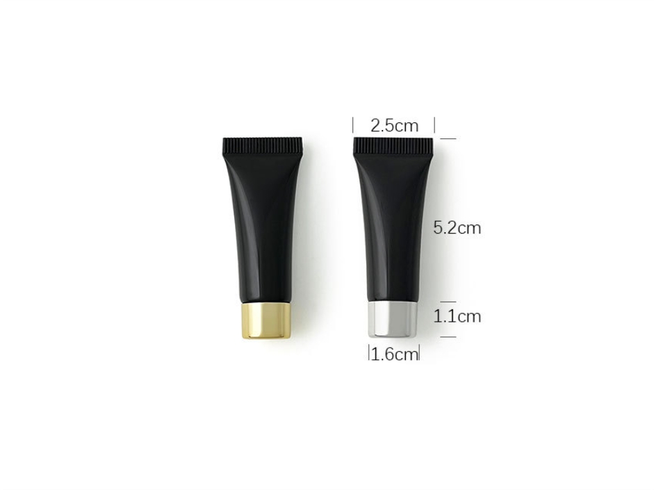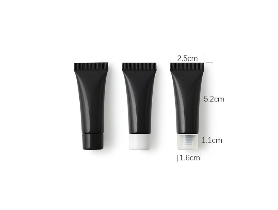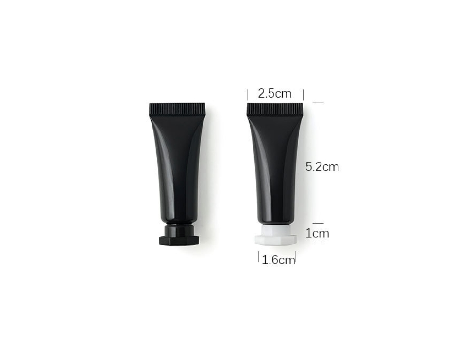 Capacity: 5g/ml Color: glossy black Material: PE hose + PP cap Aperture: 5mm hose diameter + 1mm plug diameter Application: Suitable for packaging cosmetics and skin care products, such as essence, eye cream, etc.
